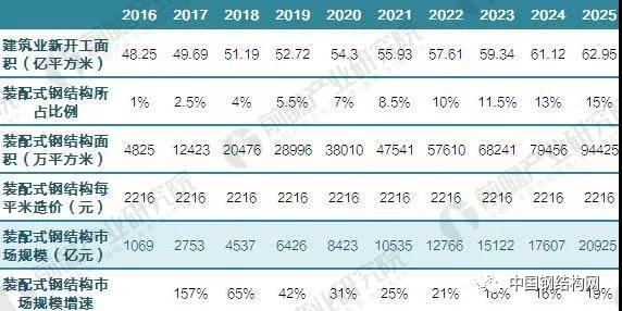 另外,按照政策的普遍要求,未來十年內(nèi)“裝配式建筑將占新建建筑面積30%、裝配式鋼結(jié)構(gòu)占15%”的比例,預(yù)測新增住宅面積每年提高3%,以10年為周期,以現(xiàn)有的裝配式建筑平均價格計算,2025年裝配式鋼結(jié)構(gòu)的市場規(guī)模將達(dá)到2萬億元。